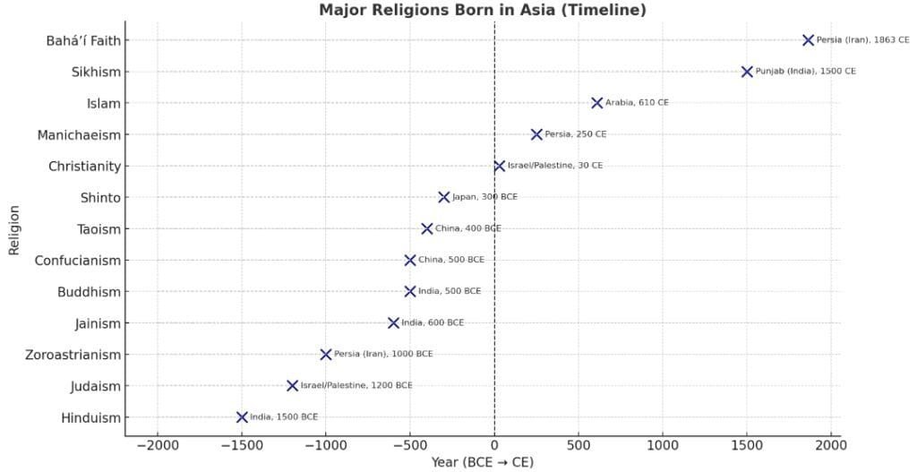 From the Himalayan peaks to the deserts of Arabia, Asia has been humanity’s spiritual heartland. Hinduism, Buddhism, Jainism, Sikhism, Confucianism, Taoism, Shinto, Judaism, Christianity, Islam, Zoroastrianism, and the Baháʼí Faith — all began here. Each faith arose from unique cultural and historical contexts but collectively demonstrates Asia’s enduring role in shaping global spirituality.