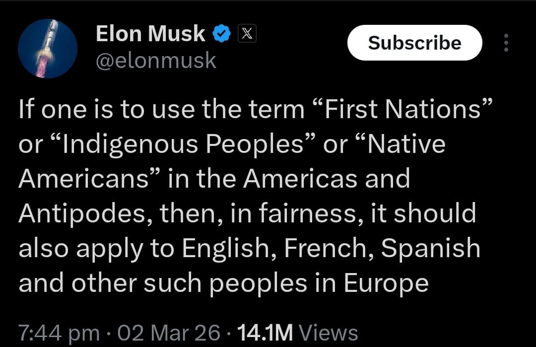 In the digital age, a single observation can ignite a firestorm of historical and philosophical debate. When Elon Musk suggested that the terms “First Nations” or “Indigenous” should, in fairness, apply to the English, French, and Spanish in Europe, he touched a nerve that spans centuries of colonial history.